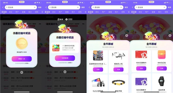關(guān)于金幣的使用,快手也提供了多種玩法。在獲得一定數(shù)量的金幣后,用戶(hù)便可參與抽獎(jiǎng),隨機(jī)抽取金幣、品牌卡券等福利;還可以前往“金幣商城”,直接使用金幣兌換豐厚好禮,不僅有亞運(yùn)吉祥物手辦盲盒,亞運(yùn)吉祥物玩具、亞運(yùn)會(huì)吉祥物鑰匙扣等,還有游戲皮膚套裝、游戲禮包以及游戲機(jī)、運(yùn)動(dòng)手表、無(wú)人機(jī)等實(shí)物大獎(jiǎng)(以金幣商城中當(dāng)前顯示獎(jiǎng)品信息為準(zhǔn)),數(shù)量有限,先到先得!