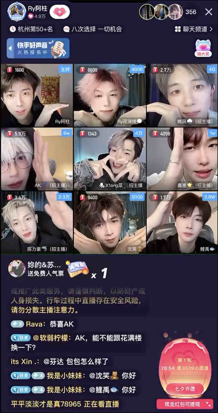 K崽:Ry瑞一文化是2021年12月成立的。我們是一家做視頻宮格直播公會,以男廳為主,目前主營快手,月流水在千萬以上,正常開播主播有1000多人。