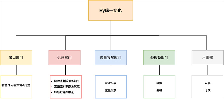 策劃部門主要負(fù)責(zé)特色廳的內(nèi)容策劃,做好內(nèi)容創(chuàng)新。此外,我們還有專門的流量投放部門,助力主播篩選與培養(yǎng)。短視頻部門有專業(yè)的編導(dǎo)和攝像,通過短視頻完善主播人設(shè)的打造。