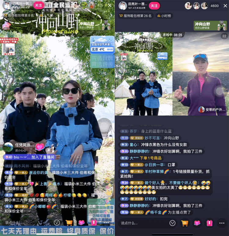 在【抖in全民運(yùn)動(dòng)?沖向山野】行業(yè)IP營銷活動(dòng)期間,抖音商城就邀請?zhí)锪?、葉一茜夫妻打造一場戶外直播專場,通過戶外真實(shí)場景,以及與戶外潮推官的創(chuàng)意連麥,實(shí)現(xiàn)內(nèi)容場向貨架場的引導(dǎo)。