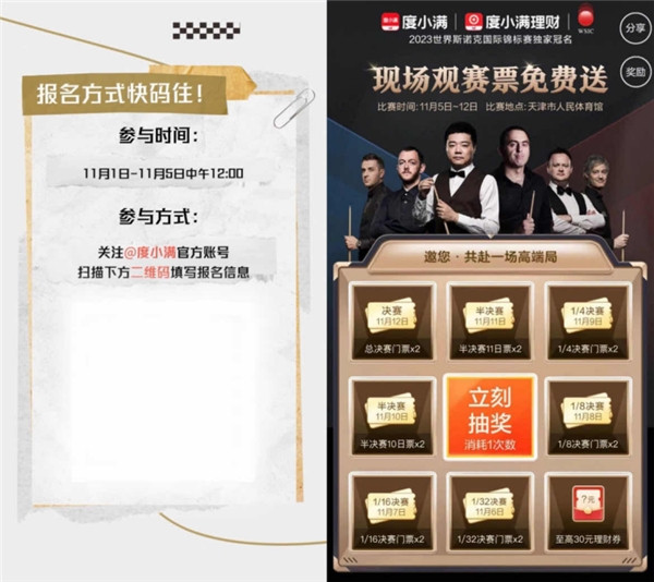 與此同時,度小滿用實際行動坐實2023世界斯諾克國際錦標賽“獨家冠名商”這一稱號,不僅豐富了端內活動,征集邀請幸運用戶親臨現(xiàn)場感受頂級賽事的熱情氛圍,還有線下見面會與球星近距離接觸互動,擁有同框合影和親筆簽名的人可能就是你!