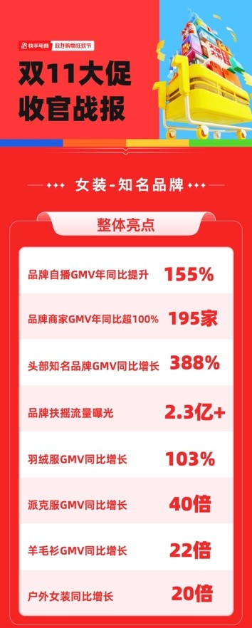 10月31日-11月11日,快手女裝品牌自播GMV同比去年增長155%,品牌商家GMV同比增長超100%的商家數(shù)量達195個,頭部知名品牌GMV同比增長388%,品牌扶搖計劃流量曝光2.3億+。其中,羽絨服品牌類目GMV同比增長103%,派克服品牌GMV同比增長40倍,羊毛衫品牌GMV同比增長22倍,戶外女裝品牌同比增長20倍。