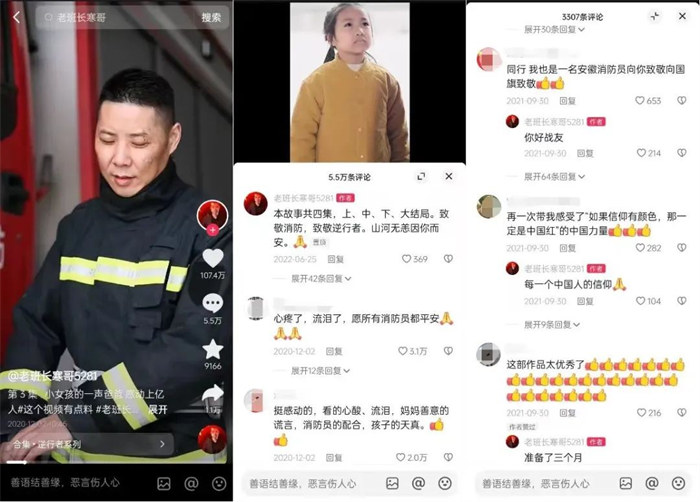 抖音內(nèi)的微短劇《承諾無聲》則將消防員題材與家庭情感題材疊加。這部講述消防員張子寒照顧犧牲戰(zhàn)友張大偉妻兒的故事改編自真實經(jīng)歷,不僅呈現(xiàn)了消防員戰(zhàn)士們舍小家為大家的勇敢、戰(zhàn)士之間互相扶持的友情,也體現(xiàn)了在日常生活中他們面對愛人和孩子的“不得已缺位”,立體的描述和生動的消防員細節(jié)也收獲了無數(shù)觀眾的眼淚。