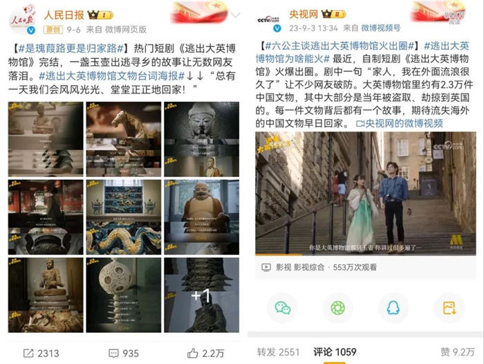 典型如今年的爆款短劇作品《逃出大英博物館》,便是在短劇用戶熟悉的古風甜寵內(nèi)容中,加入了濃烈的家國情懷,結(jié)合對“文物回歸”議題的關(guān)注,通過文物擬人的方式,將短劇的情感從小情變?yōu)榇髳?,也成功實現(xiàn)了全網(wǎng)走紅,收獲了人民日報、人民網(wǎng)、央視等多家官媒的稱贊。