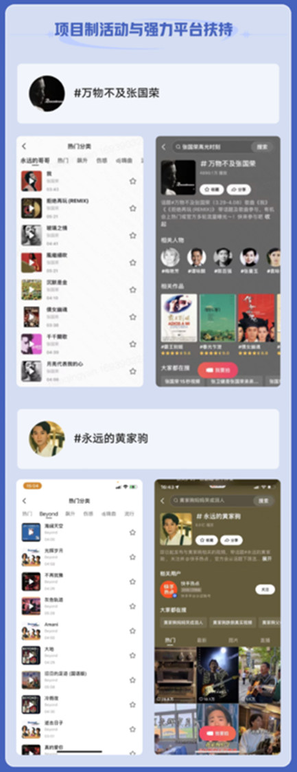 同時(shí),「π」計(jì)劃將結(jié)合手勢(shì)舞、視頻模板等站內(nèi)豐富多樣的年輕化玩法,對(duì)宣傳推廣的歌曲進(jìn)行熱點(diǎn)內(nèi)容營(yíng)銷,帶動(dòng)平臺(tái)用戶主動(dòng)參與到歌曲的創(chuàng)意使用和傳播中,持續(xù)拉高歌曲熱度。而通過各種主題活動(dòng),「π」計(jì)劃將進(jìn)一步聚攏用戶流量,實(shí)現(xiàn)系列歌曲的火熱出圈。在此之前,快手打造的#萬(wàn)物不及張國(guó)榮 和#永遠(yuǎn)的黃家駒 活動(dòng),就吸引了大量用戶帶相關(guān)歌曲發(fā)布優(yōu)質(zhì)視頻內(nèi)容,在平臺(tái)形成了一波“回憶殺”,助力經(jīng)典老歌的再次翻紅,達(dá)成數(shù)千萬(wàn)級(jí)曝光。
