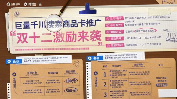 而除了產品激勵,平臺也針對雙12大促節(jié)點提供專屬的福利活動。12月1日-12月31日期間,搜索商品卡推廣將面向新客、老客兩個群體,分別推出針對性的福利活動,歡迎各位商家向銷售了解活動詳情,搶占流量先機!