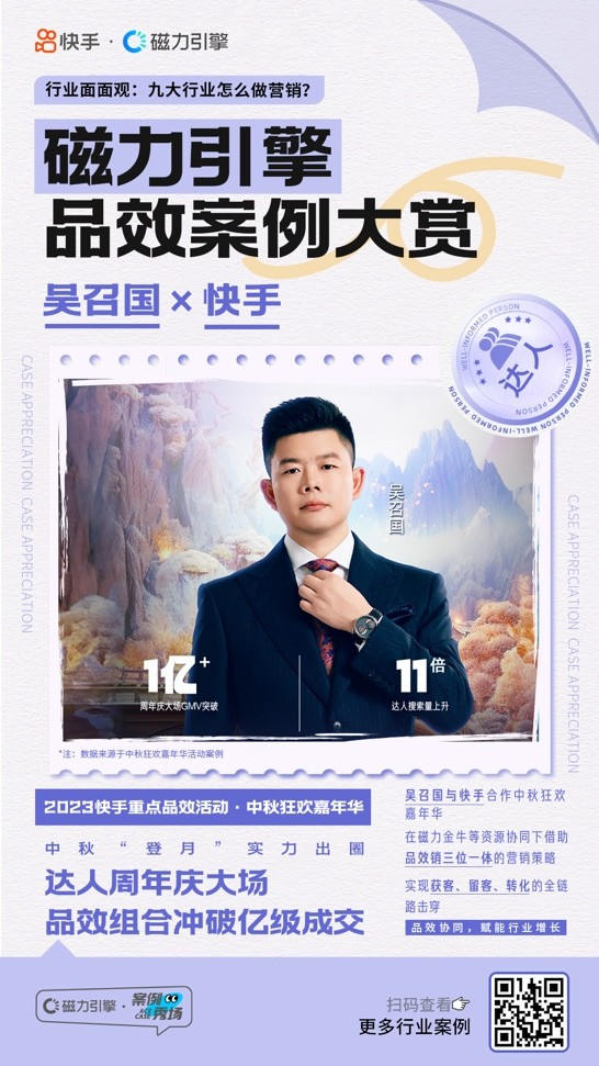 快手達人“吳召國”的案例是達人營銷品類的一個典型,以“周年慶”為契機,合作“中秋狂歡嘉年華”行業(yè)活動,直播前充分預(yù)熱,構(gòu)建直播售賣大場,直播開始后量身定制磁力金牛的有效投放策略,抬升自然流量,結(jié)合超強利潤款選品,拉升凈利潤。品效資源整合共同助力直播間人氣升溫,推動GMV總數(shù)破億,達到新高峰,最總實現(xiàn)了曝光和銷量的雙效提升。