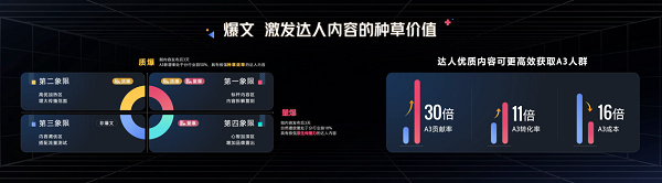 ?爆文激發(fā)達(dá)人內(nèi)容的種草價(jià)值?!氨摹蓖ǔV改切┌l(fā)布不久就獲得較高自然播放量或高效為品牌積累A3人群的達(dá)人內(nèi)容。它比非爆文內(nèi)容對(duì)于A3的貢獻(xiàn)高30倍,流轉(zhuǎn)率高11倍,A3獲取成本低16倍。通過爆文分析,識(shí)別高質(zhì)量優(yōu)質(zhì)種草內(nèi)容。