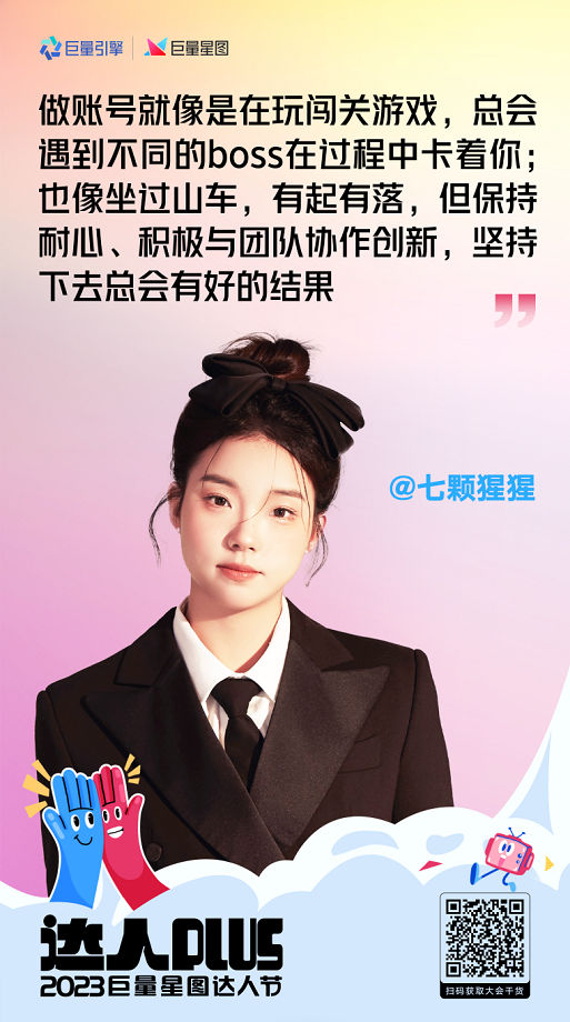 如今,越來(lái)越多的創(chuàng)作者選擇達(dá)人這份事業(yè),并為熱愛而努力著。本次巨量星圖達(dá)人節(jié)上,王七葉、車事紀(jì)、大能、七顆猩猩、放揚(yáng)的心心等達(dá)人,共同圍繞賬號(hào)成長(zhǎng)如何突破瓶頸期、內(nèi)容和商業(yè)化如何平衡等話題,分享了他們的“成長(zhǎng)心得”和“避坑指南”。