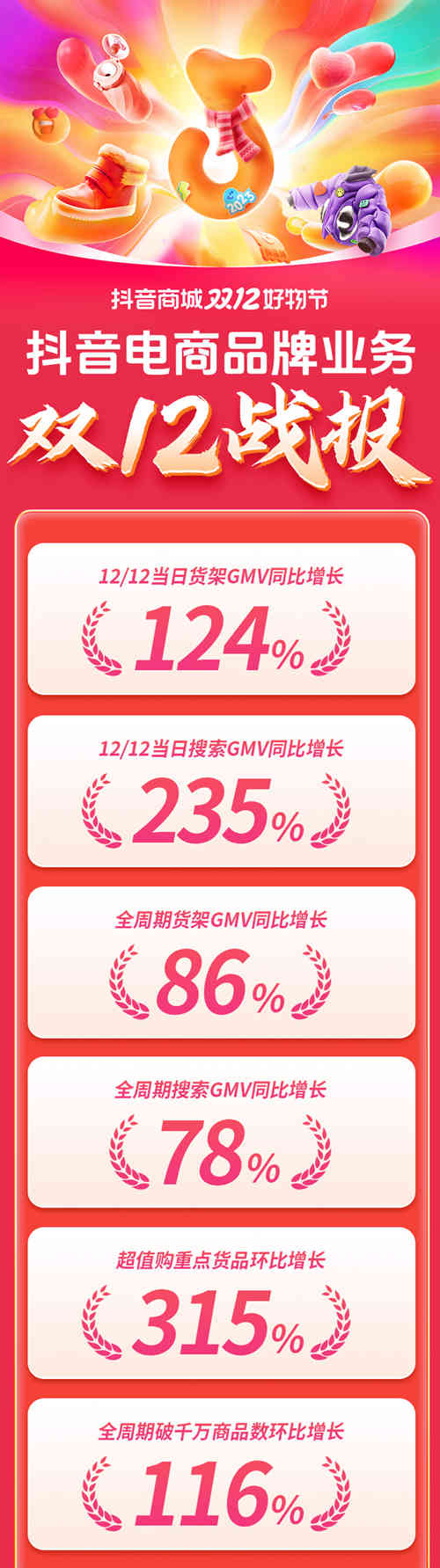 12月12日當(dāng)天,抖音電商品牌業(yè)務(wù)貨架GMV同比增長(zhǎng)124%,搜索GMV同比增長(zhǎng)235%;雙12全周期貨架GMV同比增長(zhǎng)86%,商城潛力得到進(jìn)一步驗(yàn)證,其中超值購(gòu)頻道的重點(diǎn)貨品GMV環(huán)比增長(zhǎng)315%。成交破億的品牌、單品不斷涌現(xiàn),越來(lái)越多的品牌在抖音電商找到大促生意的經(jīng)營(yíng)之道,實(shí)現(xiàn)“品銷”合一。