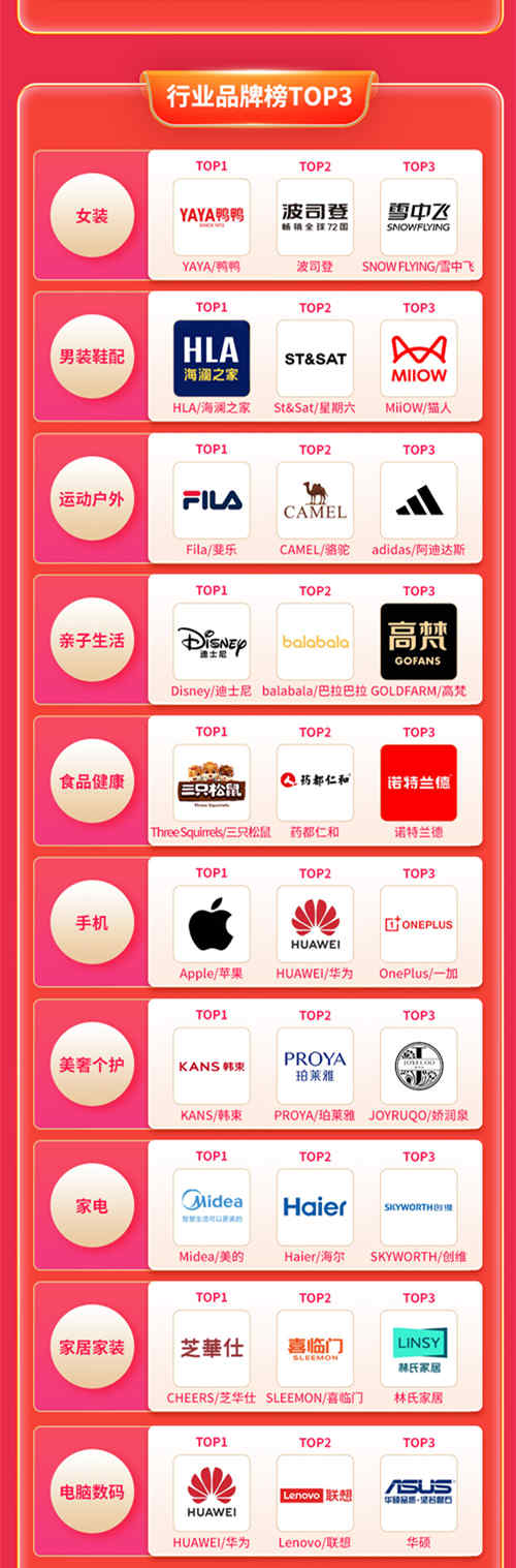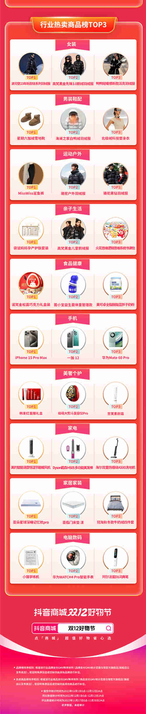 大促期間,服飾女裝、男裝綜合、3C數(shù)碼、美奢生活、運(yùn)動(dòng)戶外、親子生活、家電家居、食品健康等多行業(yè)品類銷售額增長(zhǎng)顯著,多個(gè)頭部品牌銷售勢(shì)頭迅猛,多品牌成交破億。抖音商城按照支付GMV數(shù)據(jù)對(duì)各行業(yè)TOP10品牌和熱門爆款單品進(jìn)行排序,發(fā)布各行業(yè)雙12品牌榜和爆品榜。