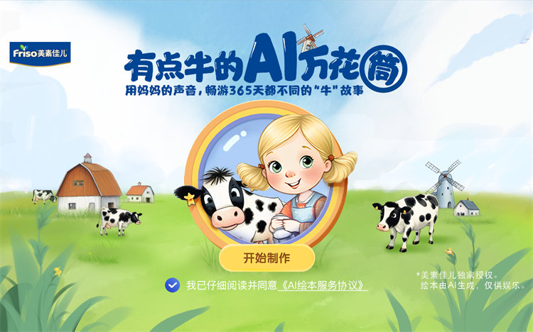 在今年雙十一,美素佳兒聯(lián)合小度打造“AIGC有聲繪本”,將美素佳兒的牧場(chǎng)故事與 AIGC 技術(shù)融合,拉進(jìn)品牌與消費(fèi)者的距離,推動(dòng)用戶對(duì)品牌形成獨(dú)特的記憶點(diǎn),進(jìn)而轉(zhuǎn)化為品牌的社交資產(chǎn)。