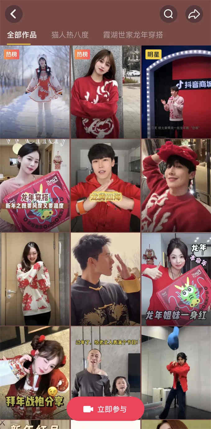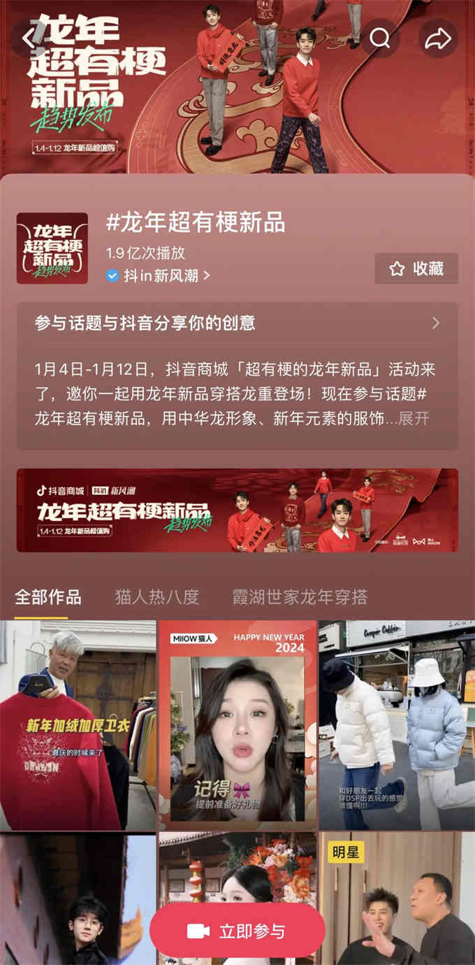 近期抖音電商大服飾行業(yè)活動抖in新風潮,在龍年到來之際攜手明星達人和頭部品牌,發(fā)起「龍年超有梗新品趨勢發(fā)布」活動,構(gòu)建營銷新場景,為眾人帶來有關(guān)龍年穿搭、龍年單品的分享,對于消費者龍年穿搭造型的借鑒、以及龍年穿搭單品的選擇有著極高的參考價值,推動著潮流趨勢與參與品牌的發(fā)展。