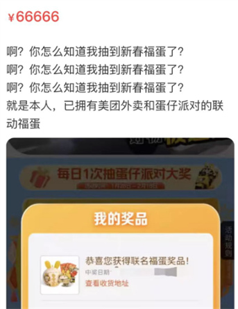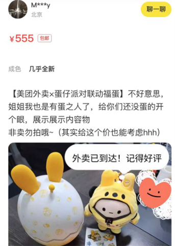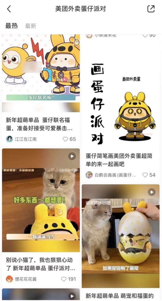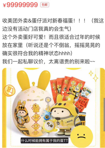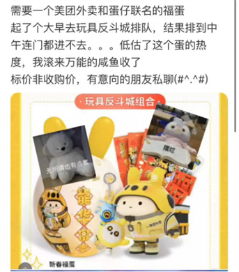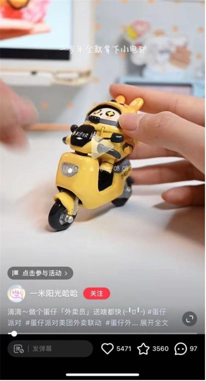 聯(lián)動周邊福蛋一經(jīng)推出,馬上成了“爆款”。在小紅書上,大批玩家紛紛曬單,稱之為“最萌年貨”。搶不到周邊但動手能力強的玩家,自己創(chuàng)作周邊,全款拿下美團外賣小電驢。