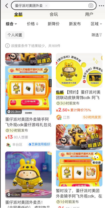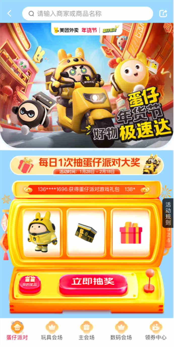 合作的影響力還走出了“蛋仔島”,來到了現(xiàn)實生活。正值過年之際,美團外賣側(cè)推出了美團外賣年貨節(jié)之蛋仔派對分會場。玩家不僅能在美團外賣抽取游戲福利和購物優(yōu)惠,還可以通過指定活動門店下單,贏取限量禮品。雙方的聯(lián)名合作,從玩法、周邊,線下門店等方面,讓玩家在游戲內(nèi),在身邊,都能通過美團外賣,找到自己的“游戲搭子”。
